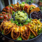 - While the tacos are baking, prepare the platter by arranging the tortilla chips, black beans, corn, shredded lettuce, salsa, and sour cream.