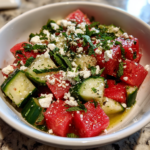 The bright red of the watermelon contrasts beautifully with the green of the cucumbers, creating a visually appealing dish that is perfect for summer barbecues, picnics, or even as a light meal during the week. As the sweet aroma of watermelon fills the air, you can already sense the refreshing coolness that awaits. With every forkful, you’ll experience the delightful combination of textures and flavors that will make you crave this salad again and again.